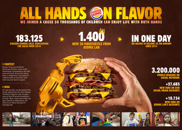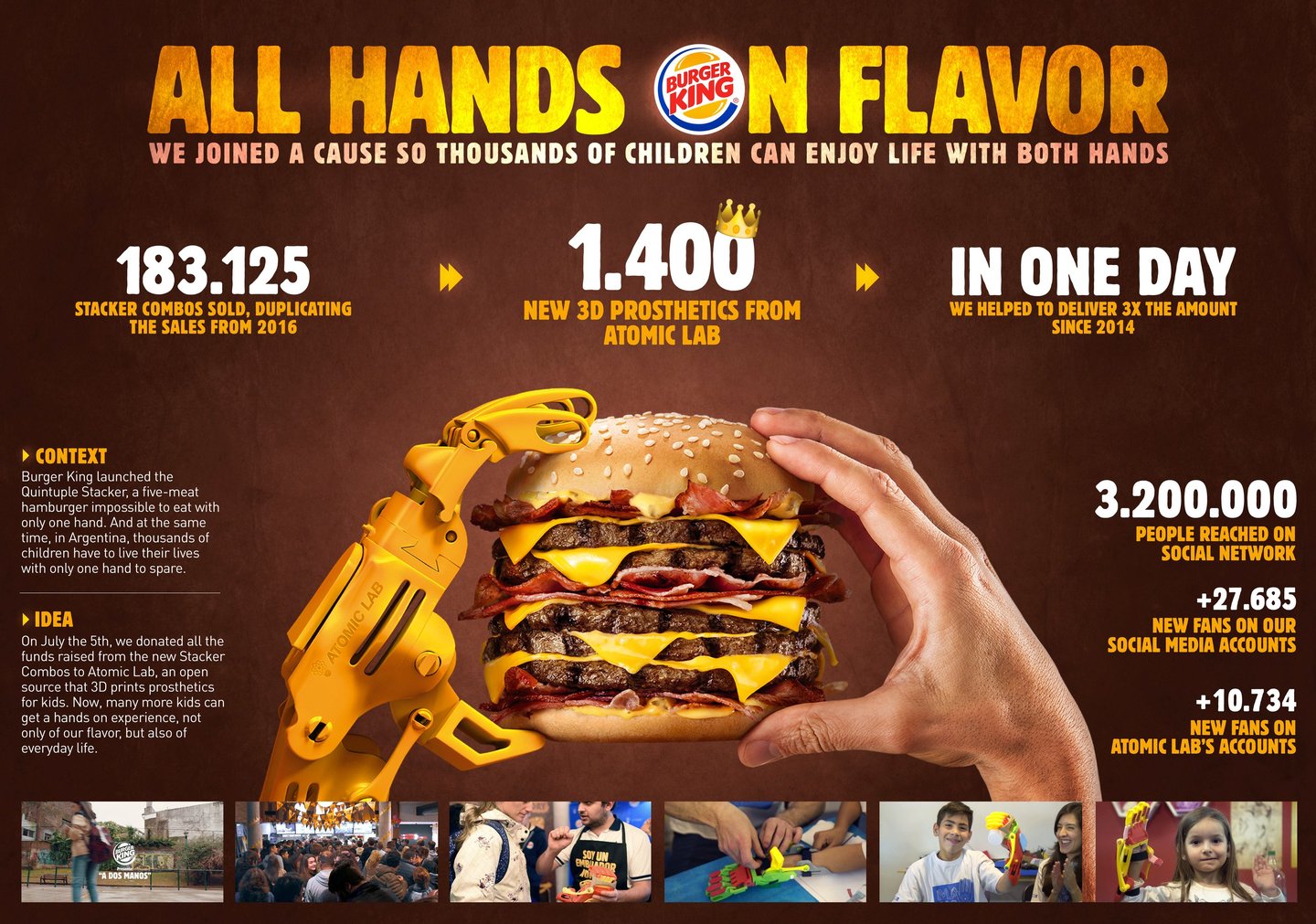 ¿Cómo lanzar una hamburguesa imposible de comer con una sola mano? Ayudando a quienes sueñan con tener dos. Para el "Stacker Day" de Burger King, nos asociamos con Atomic Lab para transformar la venta de nuestra hamburguesa más exagerada (la Quíntuple) en una colecta para prótesis mecánicas de manos 3D.